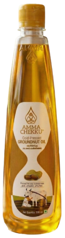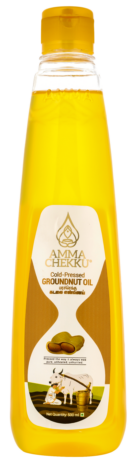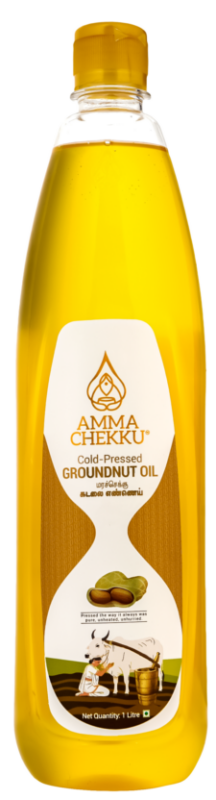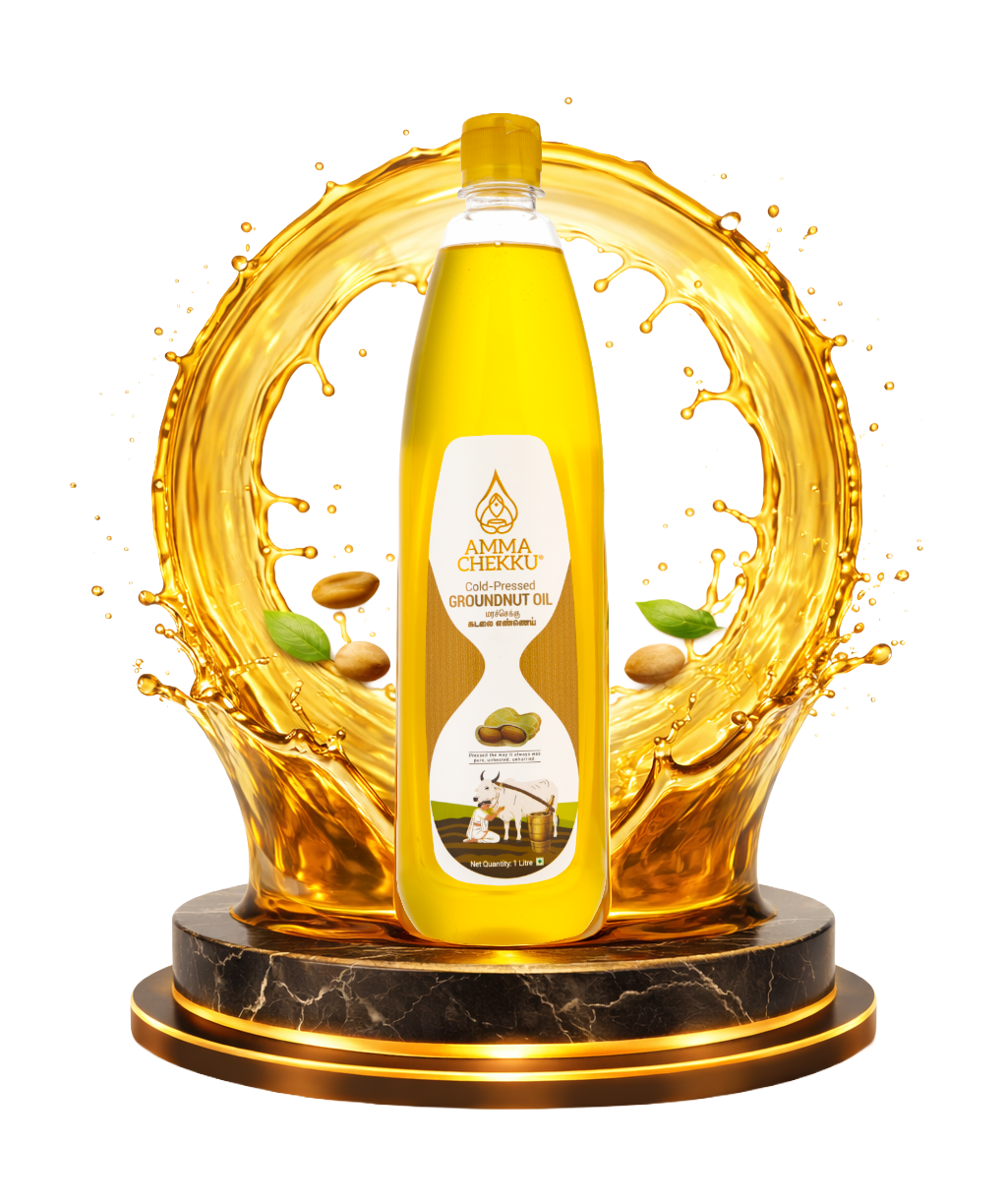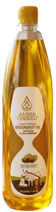 Cold-pressed groundnut oil is extracted from handpicked groundnuts using traditional wooden mills, preserving its natural aroma, rich flavor, and essential nutrients.